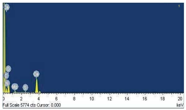 活性炭的表面化学成分是通过使用能量色散X射线(EDX)光谱确定的。得到的光谱见图2,C、N、0、Mg、Ca的百分比分别为7.64%、14.53%、35.31%、0.70%、41.80%。FTIR结果支持C、N和O的存在,该结果表明存在羰基和胺基团。除此之外,高百分比的Ca表明主要是钙的性质。此外,光谱中出现Mg表明Mg化合物与碳和氧强烈结合。因此,无论是用热蒸馏水还是冷蒸馏水,都不容易通过洗涤去除。