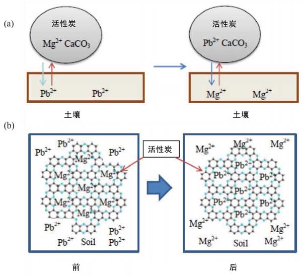 图3:(a)活性炭中的Mg2+与土壤中Pb2+的离子交换过程和(b)铅污染土壤中的离子交换。