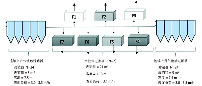 彩运cy888 图1:连续上流砂滤器和活性炭平行下游过滤器的示意图。深灰色框(F4,F6和F7)是经过改造的活性炭过滤系统,浅灰色框(Rf2和Rf5)是未改造参考活性炭。存在附加过滤器(F1和F3)。