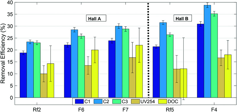 图2:改造后的(F6,F7和F4)和参考(Rf2和Rf5)过滤器中活性炭对有机物级分的去除效率。误差棒表示通过误差传播计算的标准误差(N=4)。