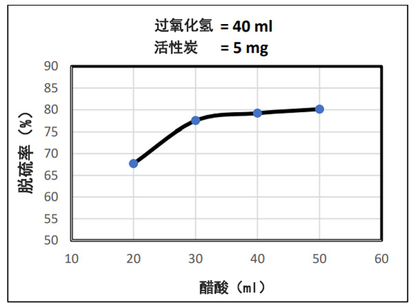 彩运cy888 在本研究的最后三个样本中,有H2O2和活性炭量是固定的,而乙酸的体积却有所变化。混合物中乙酸含量的增加会导致脱硫百分比的增加,因为发现乙酸具有比其他酸更好的氧化脱硫效果,而且大量的乙酸会导致过乙酸(CH3COOOH)的增加乙酸和(H2O2)之间的反应产生的水量。(CH3COOOH)将与大量的硫化物反应,并将其氧化为砜或亚砜。该研究的结果显示在图(3)中。