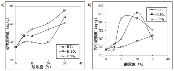 图1:酸的浓度对活性炭碘值的影响,在(a)18°C和(b)50°C下进行酸洗化学活化。