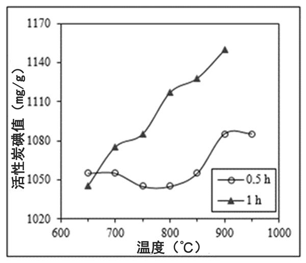 图2:活化时间(0.5和1h)对用H 2 SO 4(在50°C下30%v / v)洗涤的废活性炭的碘值(mg I 2/g活性炭)的影响在不同温度(650°C至950°C)下重新活化。