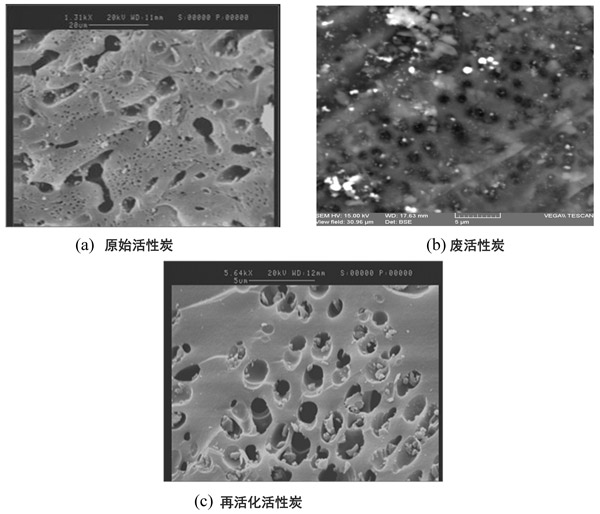 图3:(a)原始活性炭(b)废活性炭和(c)重新活化的炭的扫描电子显微镜(SEM)图像。