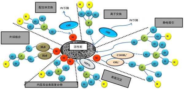 通常,磷的吸附过程是活性炭中的吸热反应。等温线包括Freundlich,Langmuir和Langmuir-Freundlich能够预测废水中活性炭对磷的吸附。在这些条件下,Langmuir通常更适合实验数据。图2总结了磷在活性炭表面上吸附的各种机理。一些机制以高亲和力和强度(例如,配体交换和内球双齿)将磷固定在其表面上,而另一些机制以较低的强度(例如,外球络合和静电吸引)固定在磷表面,从而降低了除磷效率。