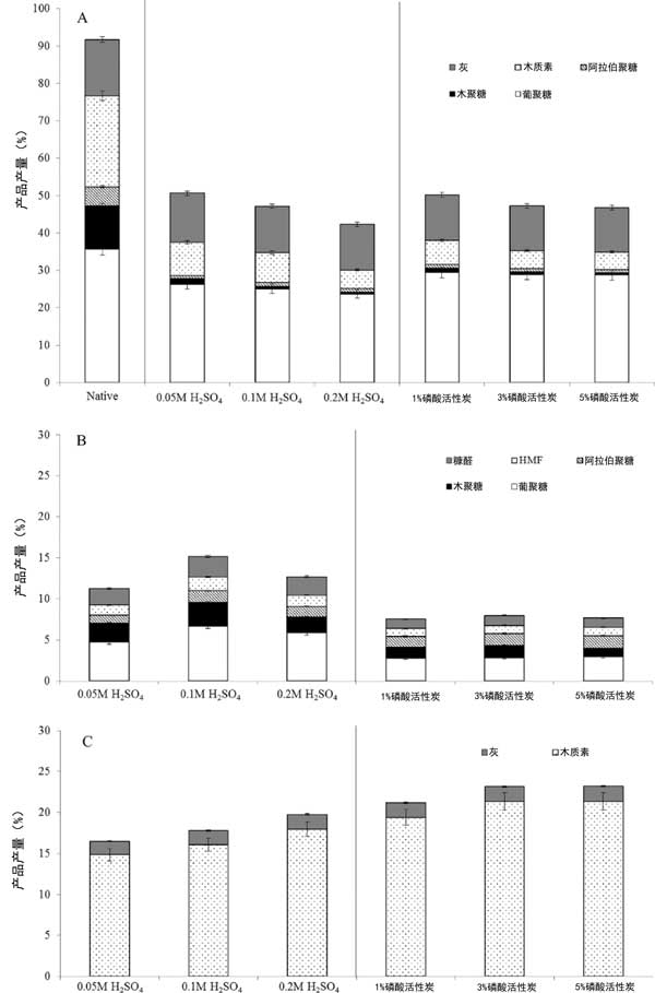 彩运cy888 图2:磷酸加入活性炭的浓度对生物质分离的影响(A)固体部分,(B)含水部分,(C)有机部分。