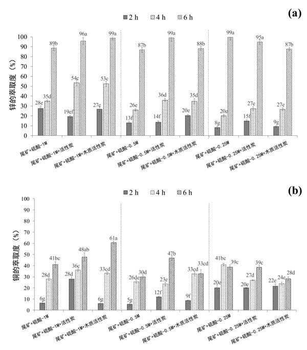 图1:活性炭在4小时和6小时后锌(a)和铜(b)的提取程度。