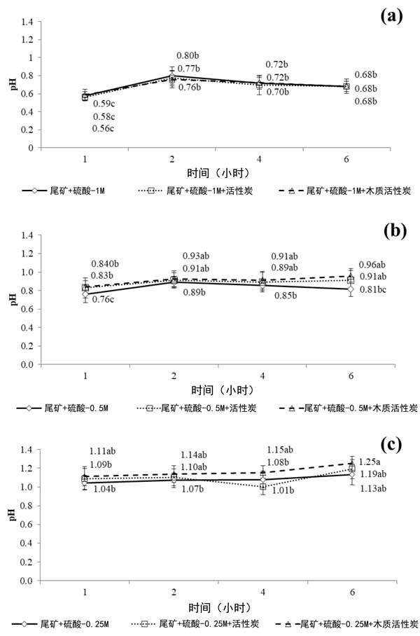 图2:H2SO4-1M样品中的pH变化(3a),H2SO4-0.5M(3b)和H2SO4-0.25M(3c)。