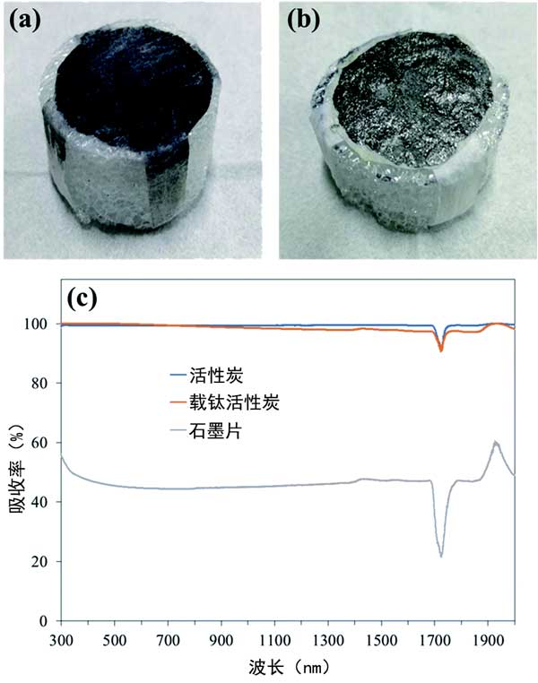 彩运cy888 图1:(a)活性炭/泡沫和(b)石墨/泡沫的图片。(c)不同光热层的UV-vis-NIR吸收光谱。