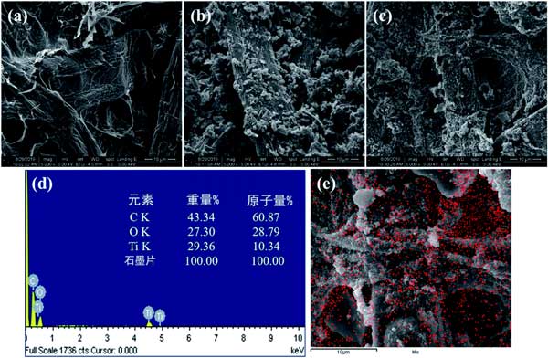 图2:(a)原始镜片组织(b)仅装有活性炭的镜片组织和(c)装有载钛活性炭的镜片组织的SEM图像。(d)载钛活性炭的EDS光谱和(e)载钛活性炭的EDS钛元素映射。
