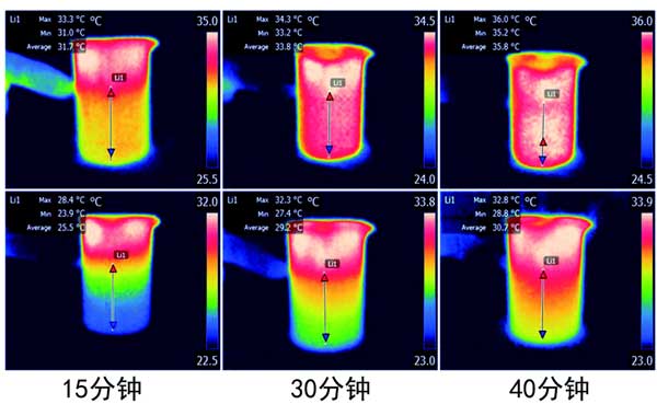 图3:辐照下的红外图像,浸没的载钛活性炭(顶部)和载钛活性炭/泡沫(底部)。