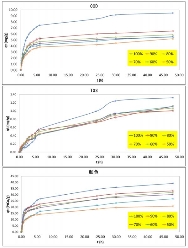 在不同温度下,棕榈油废水浓度如图2所示。所有初始浓度下的COD、TSS和颜色均显示出随接触时间增加的吸附吸收。在早期,吸收迅速增加,表明有大量活性位点可用。然后,在达到平衡时,它最终显示出饱和曲线,这可能是由于吸附剂表面的单层污染物覆盖。在所研究的操作条件下,吸附吸收或活性炭吸附的污染物量在30小时的平衡时间(图2)达到最大值。当废水浓度从50%增加到100%时,颜色也会发生变化。然而,随着废水浓度的增加,COD、TSS和色度去除率降低。这一现象表明,除了由于活性炭吸附大量污染物的能力有限外,由于活性炭上用于处理浓缩棕榈油废水的活性位点堵塞,污染物的吸附量减少。