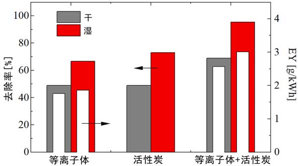 图2:在干燥和潮湿条件下,单独使用等离子体、活性炭和使用活性炭的等离子体对甲乙酮的去除(彩色条)和能量产率(白色条)。