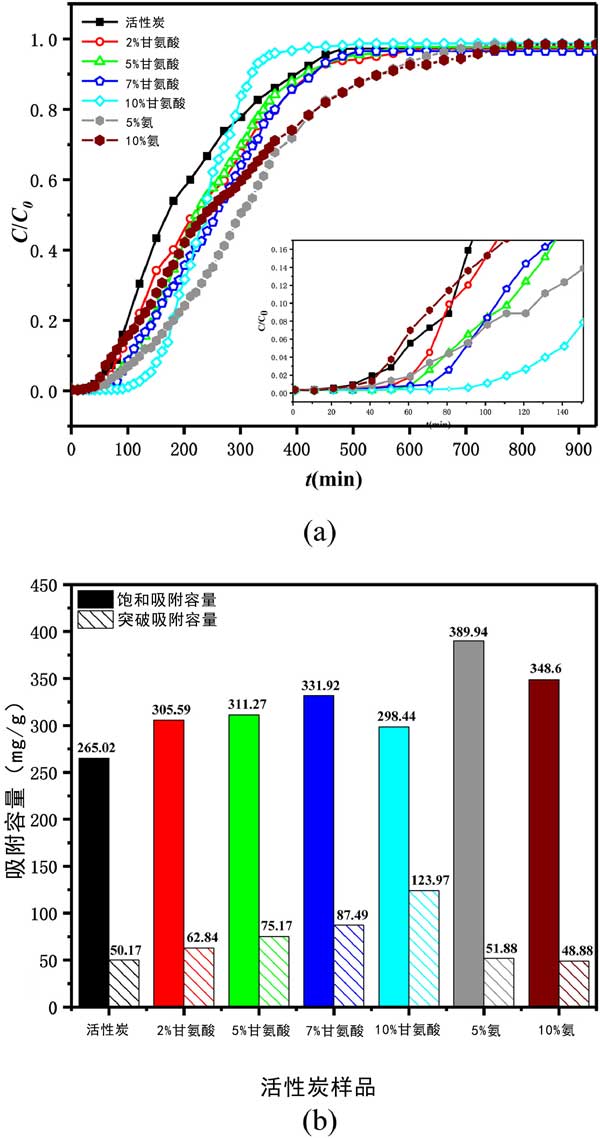 彩运cy888 测试了选定的甲苯VOC对活性炭的吸附性能。在每个实验运行中,甲苯通过装有活性炭的吸附管直到达到平衡,即活性炭吸附剂被甲苯饱和。图2(a)所示的穿透曲线呈现为甲苯吸附量吸附(ç/ç0)与接触时间(吨,分钟)六种的活性炭正在进行中,它们的饱和和突破吸附容量如图2所示(b)。从吸附曲线可以看出,甘氨酸修饰的活性炭的穿透时间明显延长,而饱和氨改性活性炭的时间延长。活性炭上甲苯穿透吸附能力的顺序为10%甘氨酸改性活性炭>7%>5%>2%>5%氨改性活性炭>未改性活性炭>10%氨改性活性炭,而活性炭对甲苯饱和吸附容量的顺序如下:5%氨改性>10%>7%甘氨酸改性>5%>2%>10%>未改性活性炭。可见甘氨酸修饰对甲苯吸附有显着的正向影响。与原来的AC相比,甘氨酸改性的活性炭对甲苯的突破吸附能力分别提高了25%、50%、74%和147%,随着甘氨酸浓度的增加呈上升趋势。同时,甘氨酸改性的活性炭对甲苯的饱和吸附容量分别增加了15%、17%、25%和13%,且随着甘氨酸浓度的增加先增加后减少。5%和10%的氨改性也提高了甲苯的吸附性能,但其优势主要体现在饱和吸附容量上,与原来的活性炭相比,分别提高了47%和32%。
