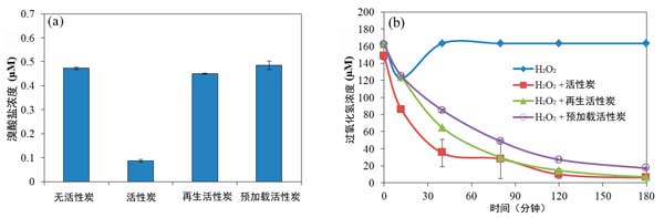 图2:(a)溴酸盐和(b)过氧化氢被不同类型的活性炭去除。