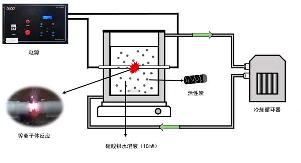 彩运cy888 研究中用于制备银纳米颗粒沉淀活性炭的液相等离子体装置在图1显示。使用左上角的电源为安装在石英反应器中心的钨电极供电。此时,脉冲宽度为5μs,施加电压为250V,频率在30kHz的运行条件下运行。液相等离子体反应器采用双管式制造,为防止等离子体产生的热量导致温度升高,在反应器外通道循环冷却水,使反应溶液的温度保持恒定在15℃。