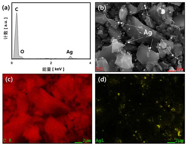 彩运cy888 图2:活性炭载银复合材料的FE-SEM和EDS分析结果:(a)EDS光谱,(b)FE-SEM实像和(c)碳元素映射图,(d)Ag元素映射图像。
