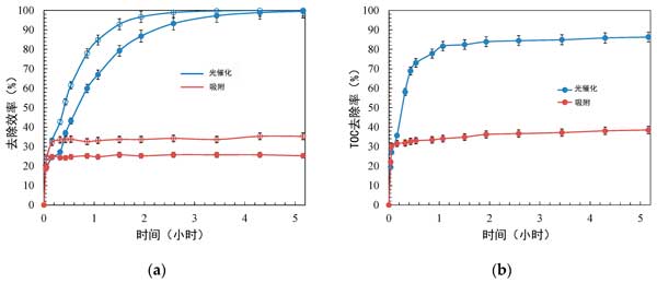 彩运cy888 图3:活性炭催化剂的吸附和光催化过程的去除效率。(a)初级降解,(b)矿化。