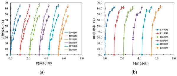 图4:使用活性炭催化剂在六个重复循环内对苯胺和苯并噻唑进行光催化降解的可重复使用性测试。(a)苯胺和苯并噻唑的初级降解(b)矿化。