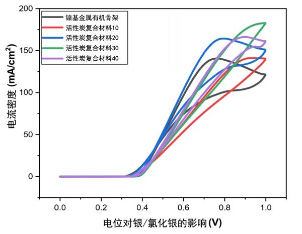 通过在KOH和CH3OH中氧化甲醇,使用循环伏安法测试活性炭复合材料的电化学性能。具有活性炭复合材料的镍金属对甲醇氧化反应表现出更高的催化活性(见图2)。在镍金属改性玻璃碳电极的情况下,峰值电流密度没有添加活性炭的高。具有更高浓度活性炭(40mg)的样品显示出高峰值电流密度。随着活性炭量(60mg)的进一步增加,峰值电流密度降会稍微降低。综上所述,建议将活性炭的浓度增加到一定限度可以提高电流密度。然而,增加活性炭的浓度也可能对催化活性产生不良后果。此外,活性炭复合材料的CV曲线具有不同的形状和峰位置,这是因为合成时活性炭分散不完全,也由于其大量使用导致催化剂发生簇集,导致覆盖金属有机框架表面,从而阻碍活性催化位点在低电位下进行反应,从而在高电位下发生电荷转移。