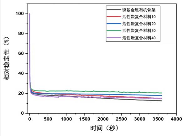 图3:金属框架及其复合活性炭在KOH和甲醇中的相对稳定性曲线。