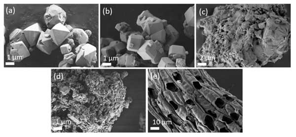 彩运cy888 图1:所选吸附剂的SEM(a)混合沸石、(b)沸石、(c)凝灰岩、(d)活性炭、(e)泥炭。