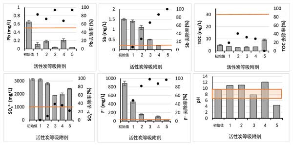 图2:活性炭等吸附剂的筛选。废水中污染物的数量显示在主y轴上的列中,污染物减少量显示为次要y轴上的黑点。橙色线是水道排放的限值。