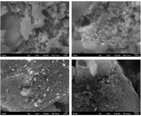 使用扫描电镜在不同放大倍数下观察氧化前(活性炭1)和氧化后(活性炭2)的表面形貌。根据SEM显微照片在图2,两者的活性炭具有不同的形状和孔的尺寸高度异质的表面。