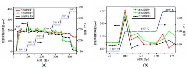 图1:(a)催化试验期间下游邻氯苯酚浓度的演变。(b)图(a)150至210℃的局部放大率。
