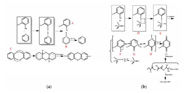 图2:邻氯苯酚氧化的反应机制,包括(a)氨改性活性炭和(b)其他改性活性炭。