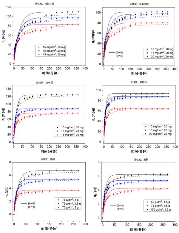 图1:使用不同吸收浓度和活性炭用量对活性炭上双氯芬酸、咖啡因和缩酮的动力学吸附数据。