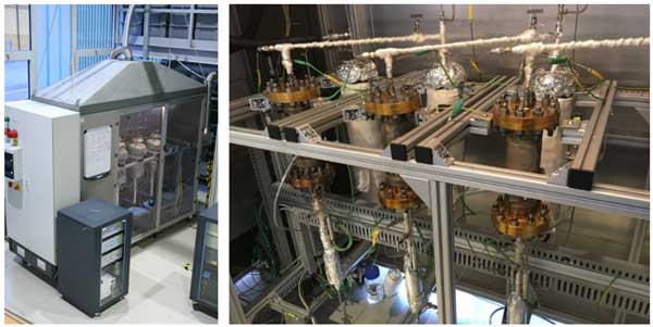 图1:实验室规模的甲烷化试验台(左),反应器和热交换器(右)。