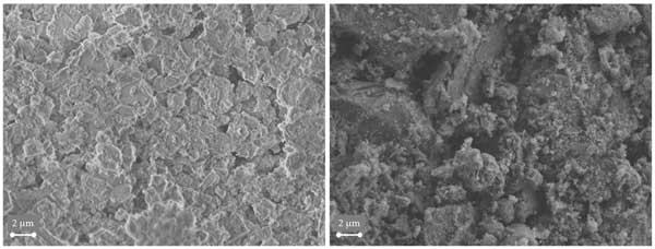 图2:新(左)和旧(右)块状催化剂球的SEM图片。