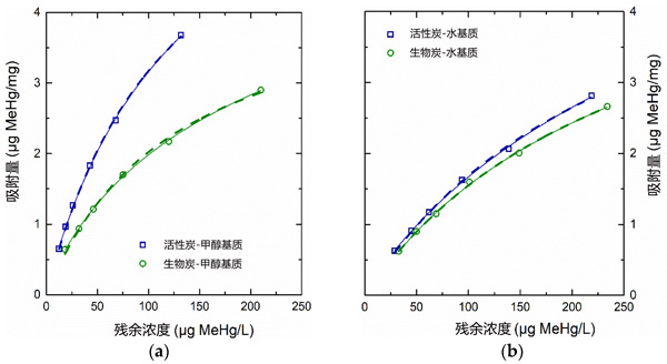 彩运cy888 为了在活性炭和生物炭材料的评估过程中应用非常现实的条件,关于甲基汞的去除,在pH值为7时应用类似天然的水以获得吸附等温线。此外,初始甲基汞浓度为500μg Hg/L,试图满足两个方面,即接近RL的残余浓度和应用等温模型的有效拟合。关于等温模型,为普遍吸附方程,考虑液相吸附。等温数据和相应方程的拟合如图1所示。所有改性材料都显示出两种模型的高度相关性,这归因于相当低的吸附负荷,因此,它们代表了单层覆盖。另一方面,当应用初始未改性材料时,在相同的实验条件下,等温模型和高残留甲基汞浓度均呈现零相关性。