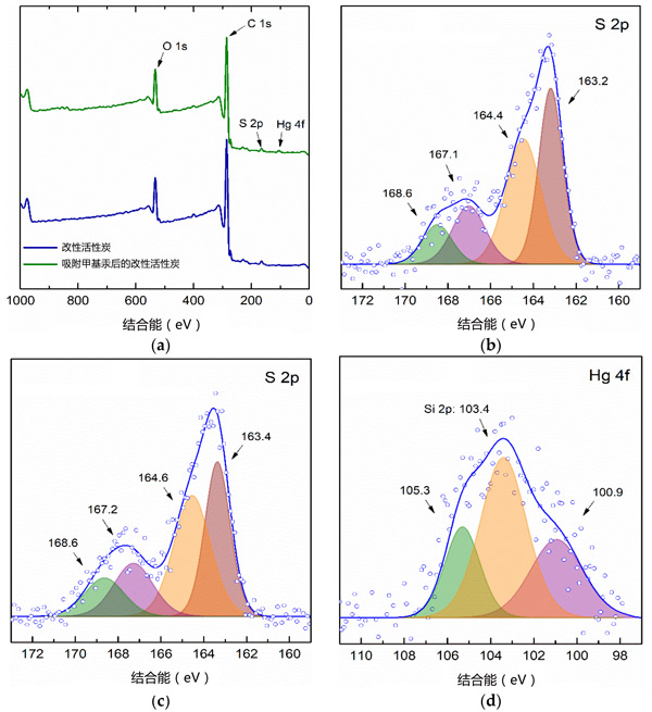 彩运cy888 图3:甲基汞吸附前后活性炭硫醇改性材料的XPS光谱,(a)活性炭(b)在甲基汞吸附之前和(c)之后的高分辨率S2p核心能级光谱,(d)以及在甲基汞吸附之后活性炭的Hg4f核心能级光谱。