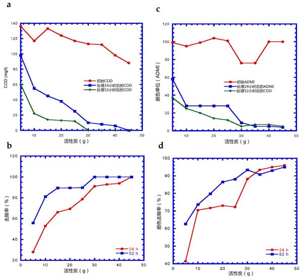 不同活性炭用量在24和54小时后COD和ADMI的变化如图2所示。在初始COD浓度为88-136mg/L的情况下,分别通过吸附染料废水24和52小时来完全去除COD需要45和30g的活性炭用量(图2ab)。ADMI的降低和去除趋势随活性炭用量24和52小时的变化与COD变化相似(图2)。ADMI随着活性炭用量的增加而降低。活性炭吸附24小时和52小时后,残留ADMI分别为4-5和5-7。随着活性炭用量≥30g,ADMI的去除效率从88-96%提高到90-95%。