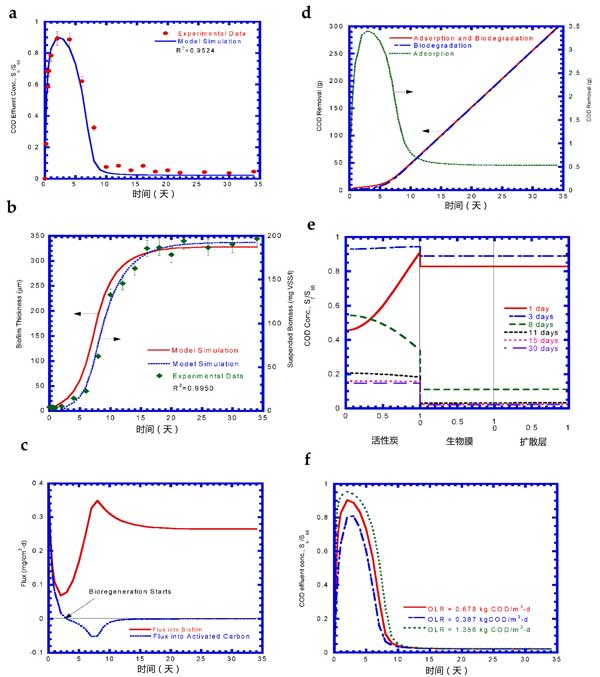 图3:实验结果和模型模拟(a)COD流出物,(b)生物质生长,(c)流入生物膜和活性炭的通量,(d)COD去除,(e)COD曲线,和(f)COD流出物各种有机负载率(OLR)。