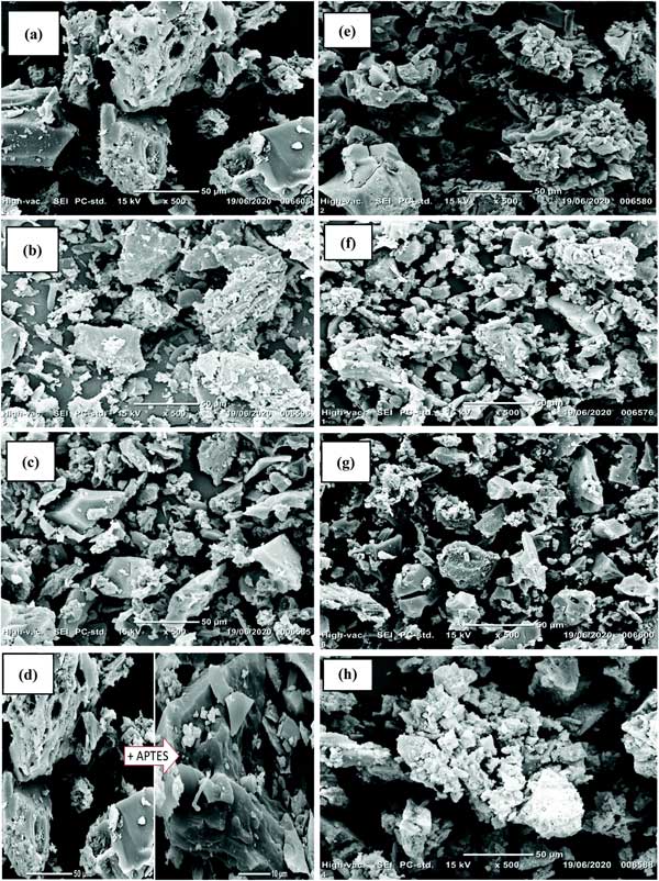 材料的SEM图像在图1中给出。活性炭具有不均匀的光滑表面,粒径约为50μm(图1a)。在用硝酸和过氧化氢进行氧化处理后,氧物质(羧基和硝酸盐基团)被接枝,导致活性炭-OH的表面比活性炭更粗糙(图1e)。通过APTES处理接枝氨基硅烷是成功的:活性炭-APTES和活性炭-OH-APTES表面分别比活性炭和活性炭-OH更光滑(图1d和f)。裂缝和不均匀的空腔可用作氟化物的吸附位点。存在的粗糙表面和大量白色颗粒证实了Al颗粒的添加(图2c、g和h)。这些白色颗粒可以对应于结合到材料表面的不同形状和尺寸的Al纳米颗粒的不同簇。