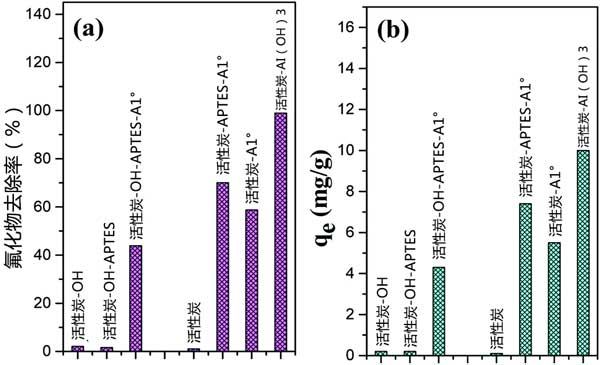 彩运cy888 图2:活性炭的各种处理对(a)氟化物去除百分比和(b)吸附能力的影响。