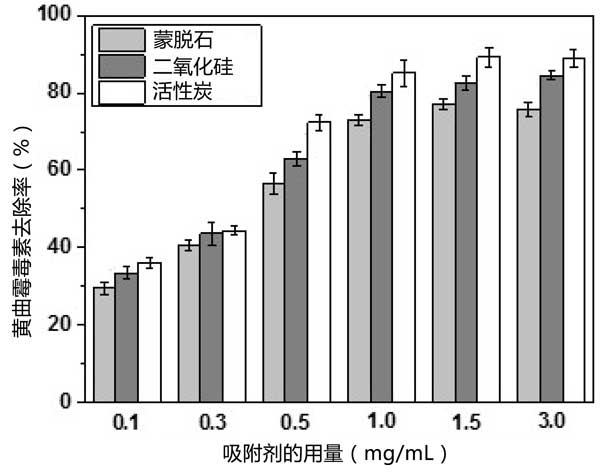 三种吸附剂对AFB1的吸附在25℃下进行24小时。图1显示了活性炭和其它吸附剂用量的AFB1去除率。无论吸附剂剂量如何,使用活性炭时去除率更高,其次是二氧化硅和天然蒙脱石。正如预期的那样,AFB1的去除率随着吸附剂剂量的增加而增加,这可以通过AFB1与吸附剂之间的相互作用增加来解释,包括氢键、孔填充和静电吸引力。吸附剂量为1.0mg/mL时,黄曲霉毒素的去除率使用蒙脱石、二氧化硅和活性炭时,分别为73.23%、80.35%和85.09%。在较高的吸附剂量(1.5mg/mL)下,去除率分别略微增加至75.56%、83.48%和89.15%。在这个吸附系统中,当吸附剂以较低浓度使用时,可用的吸附位点较少。因此,增加吸附剂浓度有效地增加了吸附位点的数量,从而提高了AFB1的去除率。但浓度过高时,吸附剂颗粒间会发生胶结、絮凝和团聚现象。这导致可用吸附位点的数量稳定或减少,并且去除率没有进一步提高。此外,当吸收剂以高浓度使用时,可能会消除维生素E和甾醇等微量营养素,从而导致营养流失。因此,使用浓度为1.0mg/mL的吸附剂被认为是合适的,因此在进一步的实验中被采用。
