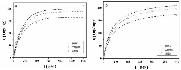 彩运cy888 图2:(a)黄曲霉毒素在活性炭和其它吸附剂上吸附的拟一级动力学模型拟合曲线和(b)拟二级动力学模型拟合曲线。