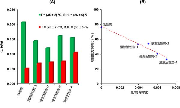 甲基碘吸附容量的降低程度取决于活性炭的性质(图2(A))。正如预期的那样,对于未浸渍的吸附剂观察到有害的影响,其中仅已知不涉及CH3I吸附的特定相互作用。更准确地说,当从活性炭材料的第一组条件转移到第二组条件时,概述了大约76%的吸附容量下降(图2)。在这方面,为了克服与水蒸气和温度相关的影响,三乙二胺浸渍是必不可少的。最近,由于水对三乙二胺分子具有很强的亲和力,因此三乙二胺浸渍可以通过释放载体的活性位点来提高活性炭的保留性能]。此外,与其他机制(尤其是物理吸附)相比,化学吸附甲基碘的比例随着温度升高而增加。然后,三乙二胺与甲基碘的化学反应性将在较高温度下增强。得到的结果(图2)表明随着氮含量的增加,在“恶劣条件”下的保留性能逐渐提高。因此,以浸渍中含量最高为特征的活性炭-4吸附剂的吸附容量仅降低了33%。更准确地说,可以推断出所有考虑的吸附剂的减少幅度和摩尔比之间的准线性关系(图2B)。根据这种关系,似乎需要浸渍,以确保在更严格的条件下更牢固地固定甲基碘。