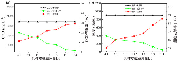 图1:活性炭载铝质量比对(a)COD和(b)2小时色度去除的影响。