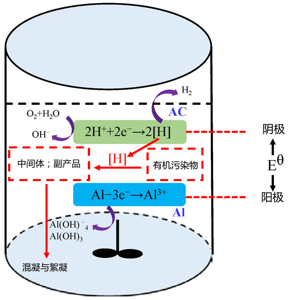 彩运cy888 根据实际工况,提出了一种可行的活性炭载铝微电解工艺分解水生环境中有机污染物的反应机理(图2)。由于其高吸附容量和电导率,活性炭被用作阴极保护。在阳极(铝废料),由铝提供的电子通过微型原电池转移到阴极(活性炭),吸附在阴极表面的有机污染物受到这些释放的电子的攻击。水电离产生的H+在阴极获得电子并产生具有强化学反应性的活性氢[H]或H2,和活性氢[H]·可以部分降解有机污染物。此外,Al失去三个电子形成铝离子(Al3+)。然后,铝离子沉淀形成氢氧化铝(Al(OH)3、Al(OH)-4等)。作为有利的絮凝剂,这些氢氧化铝可以有效去除废水中的有机污染物。难降解污染物在活性炭载铝微电解工艺的辅助下被分解为小分子中间体,也可以通过氢氧化铝絮状污泥的絮凝共沉淀来消除。换言之,与活性炭载铝微电解工艺相关的许多协同效应可以有效地分解水环境中的有机污染物。