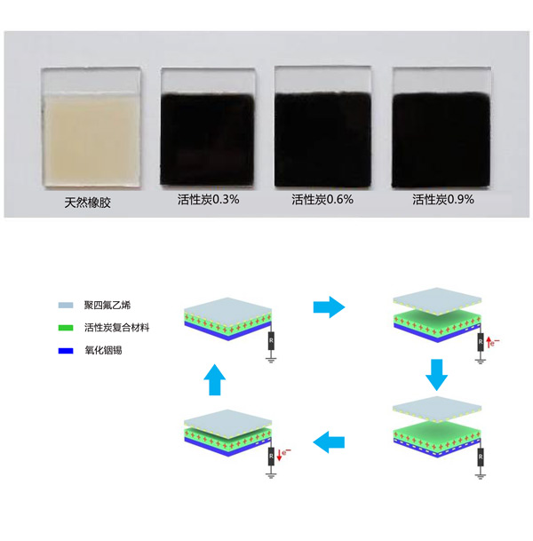 经过长期研究制成的活性炭橡胶复合材料并用于制造摩擦纳米发电机,以将机械能转化为电能。由于活性炭填充材料的多孔结构的高表面积,活性炭填料的加入可以提高摩擦纳米发电机的电输出性能,这也可以作为电荷俘获位点来增强起电过程中产生的摩擦电荷。活性炭的合适浓度为0.6%,产生的最高电功率密度为242mW/m2,几乎是没添加活性炭材料发电机的三倍。产生的电力能够为商用电容器充电,从而为小型电子设备供电。此外,采用单电极配置的活性炭摩擦发电机能够检测人体的运动,可应用于运动传感应用。