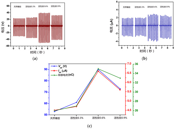 彩运cy888 图2:(a)输出电压,(b)输出电流,和(c)橡胶和活性炭含量0.3、0.6和0.9%的复合材料的转移电荷。