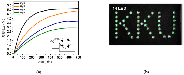 彩运cy888 图3:(a)由活性炭制造的摩擦纳米发电机产生的电力充电的电容器的充电电压曲线(b)发电机电输出可瞬间点亮44个绿色LED。