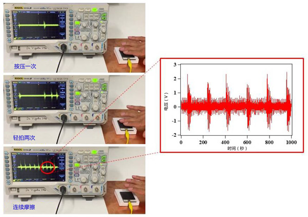 彩运cy888 活性炭摩擦电材料制成的发电机产生的电力能够充电或存储在商业电容中,如图3a中10、22、33和47µF电容器的电压充电曲线所示。47µF电容器在550秒内充电至3V。此外,如图3b电力被证明可以瞬间点亮44个绿色LED。此外,还展示了活性炭材料的运动传感应用。如图4所示,使用裸手指作为接触电极测试了单电极模式下的摩擦纳米发电机。当手指接触到活性炭材料表面时,即刻产生电信号,如图4所示。该信号可以用作运动传感器,可以检测任何运动,例如人体或薄膜表面上的物体的运动。
