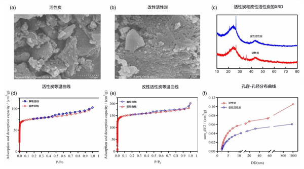 彩运cy888 当原活性炭经受0.1mol/L、0.5mol/L和0.8mol/L高锰酸盐,煅烧温度为400℃、500℃、800℃,煅烧时间为2小时,5小时和7小时。通过三因素三水平正交试验和极差分析筛选出改性活性炭的合适组合。改性后观察到活性炭表面形态发生显着变化,分别如图1(b)所示。改性前的活性炭表面有较大的团聚颗粒,表面没有明显的孔隙结构。改性后表面粗糙,呈不规则凸起的刺状颗粒结构,孔隙结构发达。改性前后活性炭的XRD图如图1(c)所示。活性炭改性前后的峰形相似,但一些峰出现,另一些峰消失。图1(d)和1(e)分别显示了活性炭改性前后的吸附和解吸等温线。它们整体呈随P/P0增加的趋势,吸附量增加,但在相同情况下,改性活性炭的吸附能力更强。图1(f)为改性前后活性炭的孔容孔径分布,改性后的活性炭孔体积更大。改性活性炭的比表面积是活性炭的两倍,累积吸附总孔体积是活性炭的1.72倍。