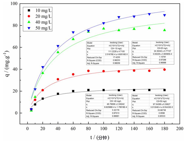 彩运cy888 根据动力学方程,当温度为25℃且改性活性炭用量为8g/L时,拟一级动力学和拟二级动力学分别用于拟合。发现二阶动力学方程的拟合效果更好,结果如所示图2。
